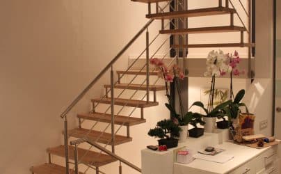 Pour vos intérieurs : escaliers en tous genres (suspendus, autoporteurs, métalliques, classiques, hélicoïdaux…), habillage de marches, garde-corps, passerelles, paliers.